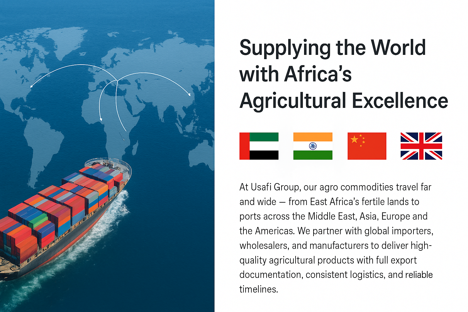 At Usafi Group, our agro commodities travel far and wide — from East Africa’s fertile lands to ports across the Middle East, Asia, Europe, and the Americas. We partner with global importers, wholesalers, and manufacturers to deliver high-quality agricultural products with full export documentation, consistent logistics, and reliable timelines.